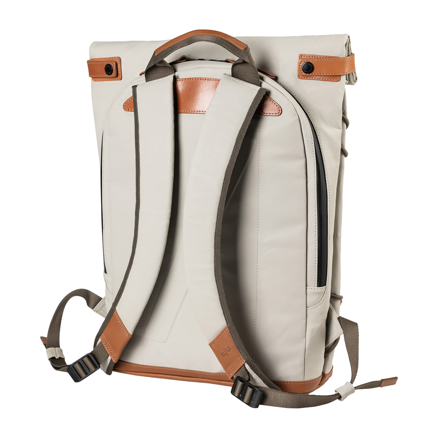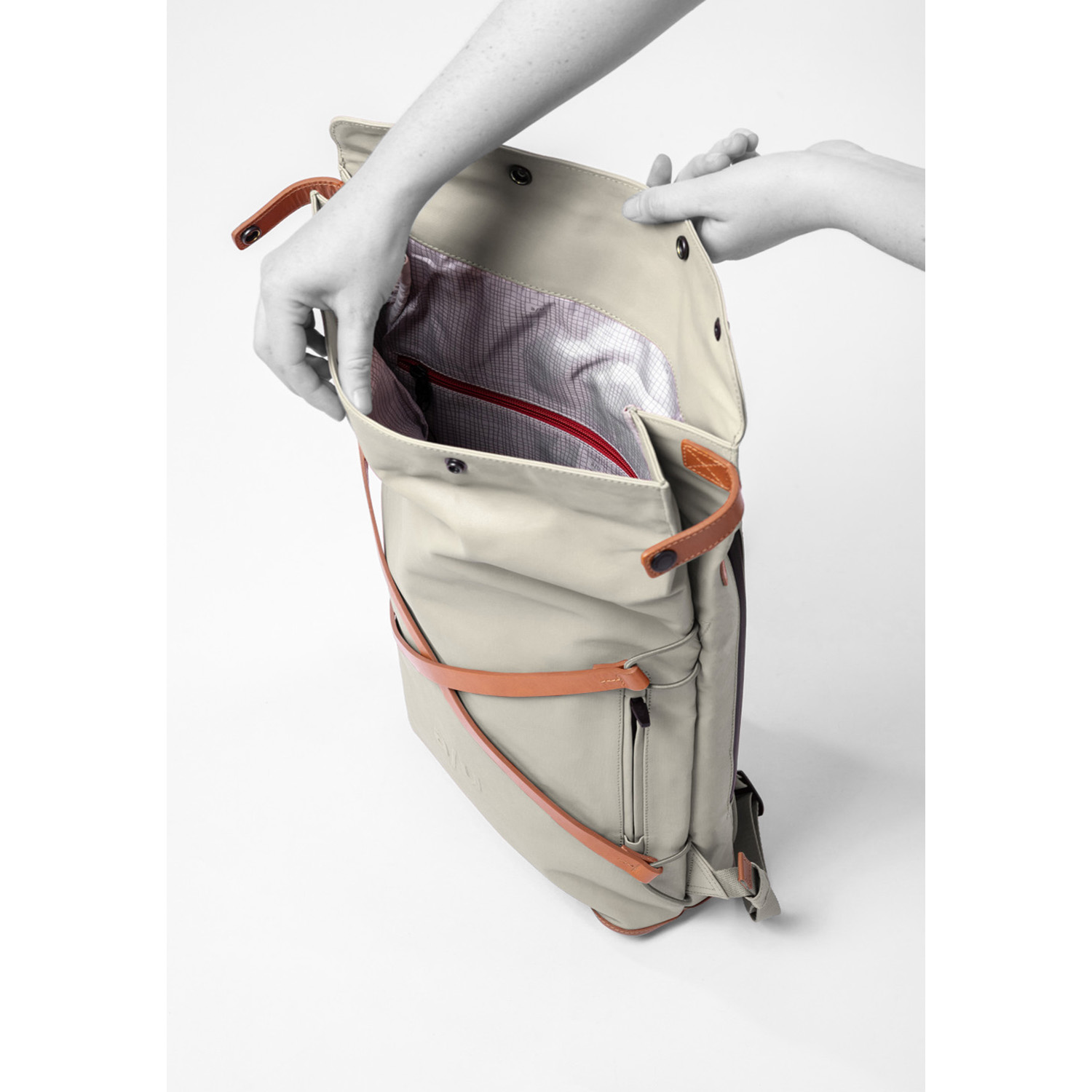 Das Hauptfach schließt mit dem Rollverschluss und Druckknöpfen und beinhaltet ein gepolstertes Tabletfach, ein großes Reißverschlussfach, ein Steckfach, ein Handyfach und zwei Schlaufen für Stifte. Der lederne Boden ist verstärkt. Außen hat der Osaka ein großes, wasserdichtes Reißverschlussfach an der Oberseite, sowie je ein wasserdichtes Reißverschlussfach auf der Vorder- und auf der Rückseite.